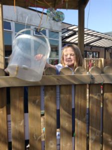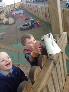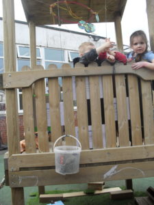 We now have a Pulley system in our tree house area and the children have been really enjoying transporting water, mud and objects from the ground to the higher level. They have been working as a team to lower and lift repeatedly, which is helping to develop their understanding of weight distribution, engineering and gross motor skills.