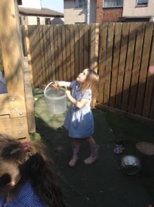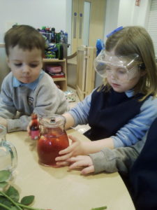 During March we also completed some fun experiments for Science week throughout the Nursery. Here the children were experimenting with food colouring to see if it could turn white roses different colours. The children also developed their numeracy and mathematical awareness here as they used different measuring tools in order to place the correct amount of water and dye into the test tubes.