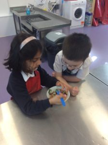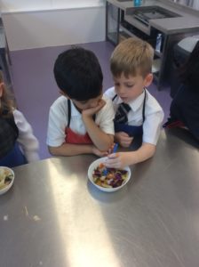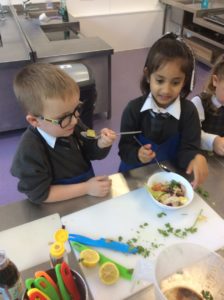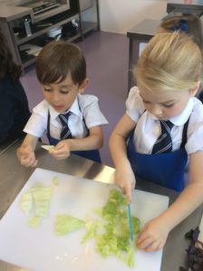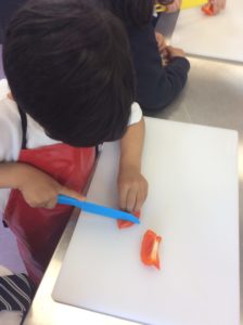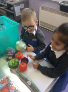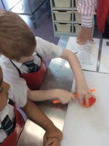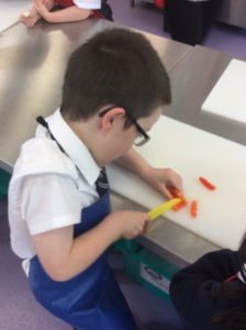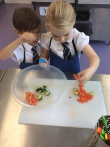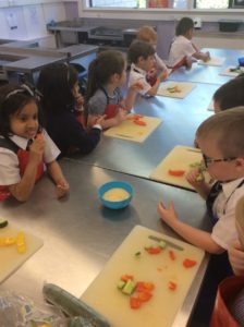 So far we have made hummus with fresh chopped vegetables, a rainbow salad as well as salsa and guacamole! The children have enjoyed choosing lots of colourful fruit and vegetables to createย their recipes and have learned the bridge and claw techniques when using their knife.