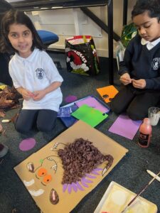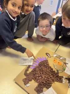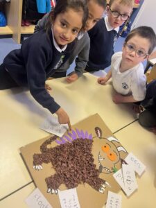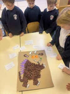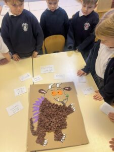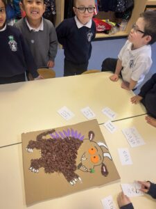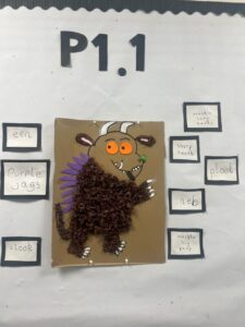 We read the Gruffalo in Scots and picked out some of the describing words, then added these to our very own Gruffalo creation! The children loved identifying the words in Scots and trying to have a go at figuring out the meaning.