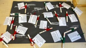 Today we read the story ‘Stick Man’ and went to the forest to find our own stick character for story writing. We took our character on an adventure and then went back to the classroom to plan our story.