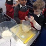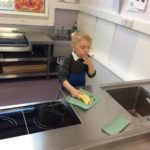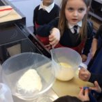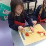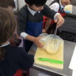 We made crepes by mixing and whisking eggs, flour and some milk. We enjoyed chopping bananas and strawberries for the toppings along with some chocolate, sprinkles and ice cream. Yum 🙂