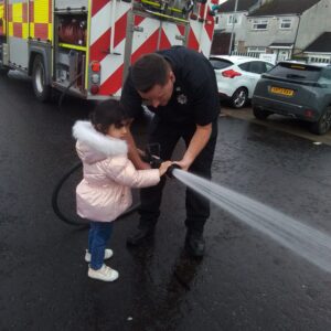 There has been discussions about people who help us in our community. We were so lucky that the local Fire Brigade were free to visit us and explain their role in how they help us. We all got the chance to fire the hose and the choice to sit in the fire engine.