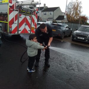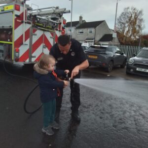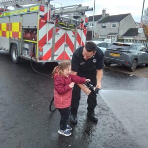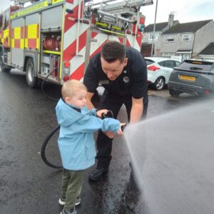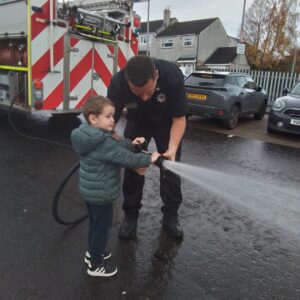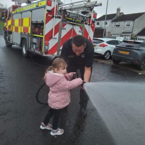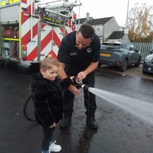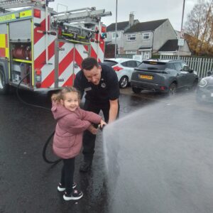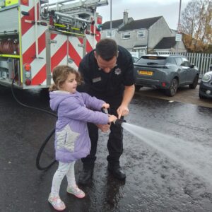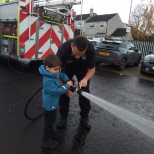 There has been discussions about people who help us in our community. We were so lucky that the local Fire Brigade were free to visit us and explain their role in how they help us. We all got the chance to fire the hose and the choice to sit in the fire engine.