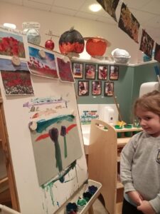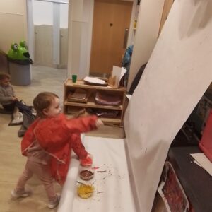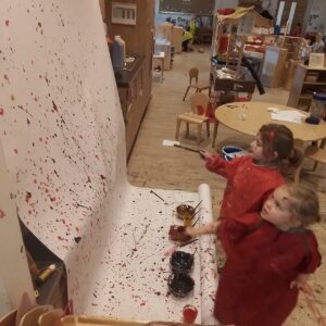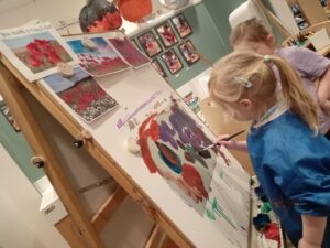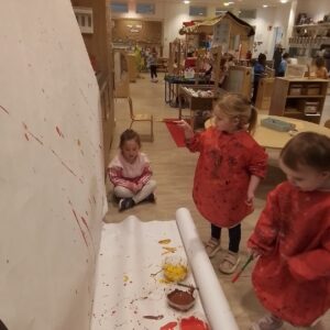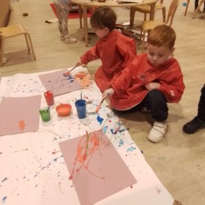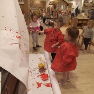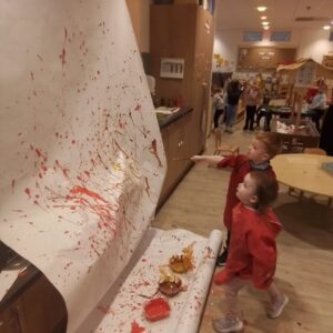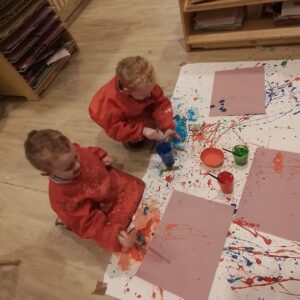 The children have been inspired by the artist Jackson Pollock and have been creating their own artwork using a splatter technique.