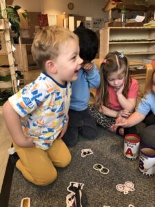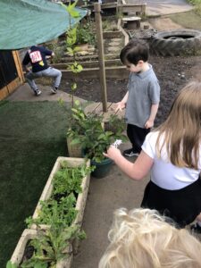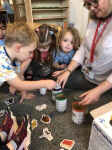 The children in the red group had the opportunity to help identify the sounds of the letters and then organise different items into the corresponding lettered tubs by identifying the initial sounds.