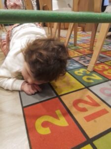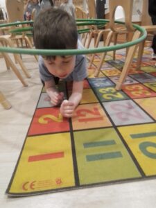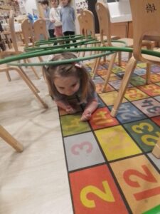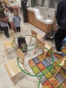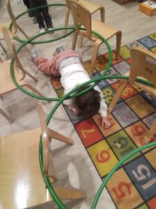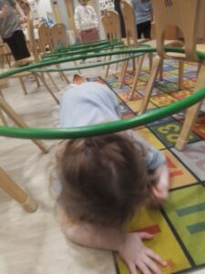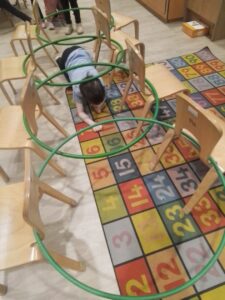 The child are developing their physical skills outdoors and inside the play room. They participated in an obstacle course learning to wait their turn and move their body in different ways, over, under and through.