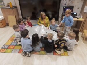 The red group are enjoying participating in Book Bug sessions. They are developing their knowledge of rhyme and rhythm whilst keeping the beat. We use the material to help keep the beat to the rhyme by working together and moving the material up and down, which in turn moves the puppet in the air.