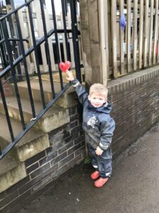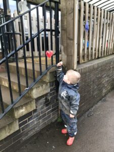 ♥ Finding valentines hearts. They have been used their detective skills to find all the hearts around the garden. They have been developing their number skills when finding the hearts and organising them in the correct order.