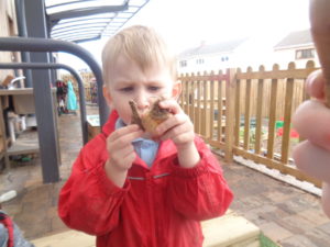 A child in the orange group showed a keen interest in bugs and insects while outdoors, this child then found a big green Caterpillar while outside which sparked conversation and interest throughout the nursery around caterpillars and how they transform into butterflies.