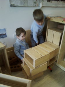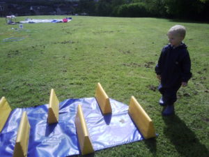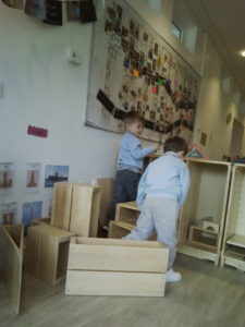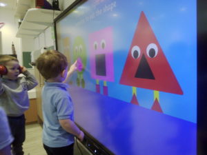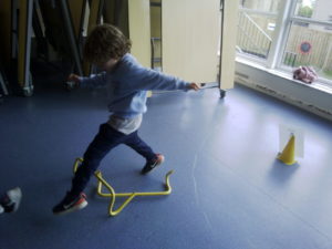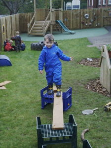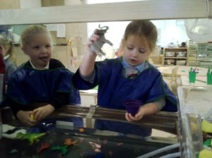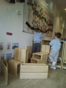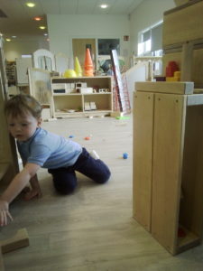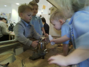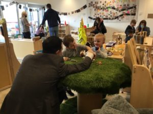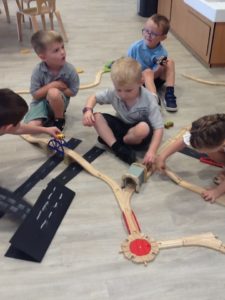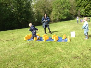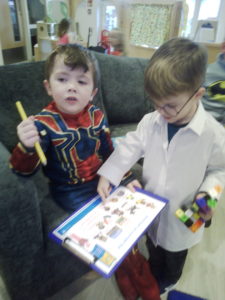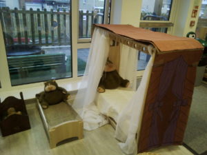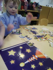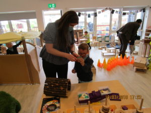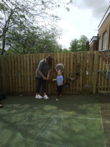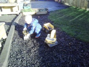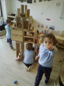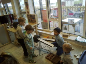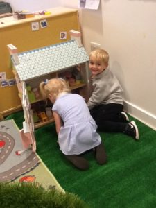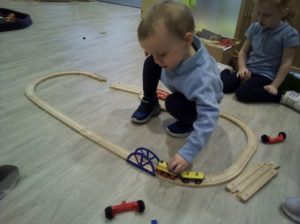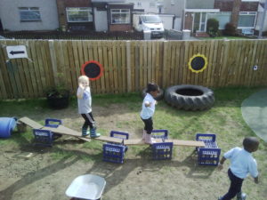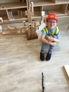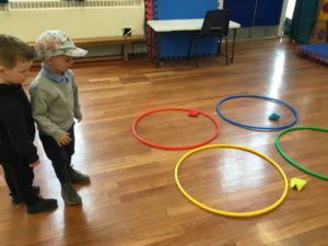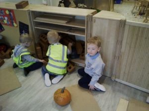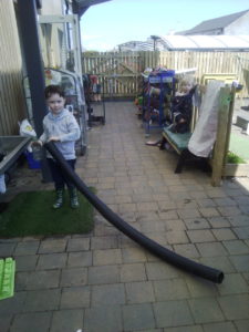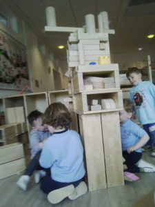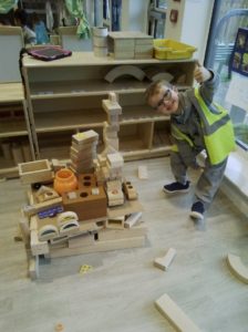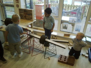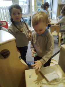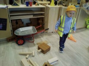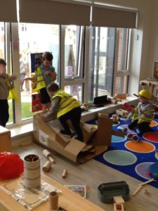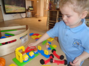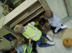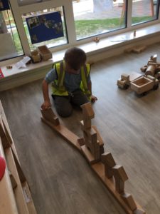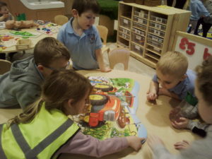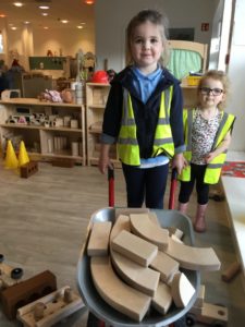 In the Construction area the children have been exploring cause and effect. Here you can see the children made a really impressive raised road for their cars to drive through. The angle in which they made the road allowed them to release their cars and allow them to fall into the basket at the end without having to push them along the track.