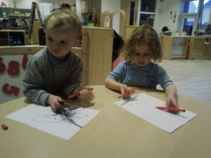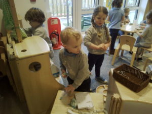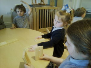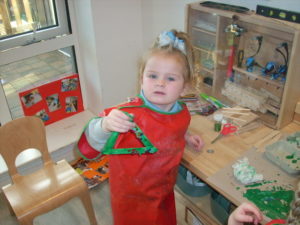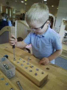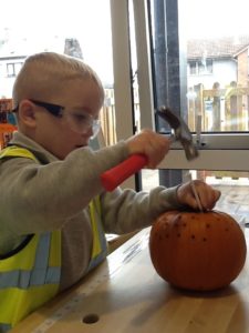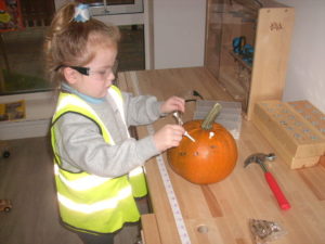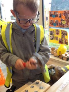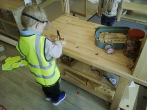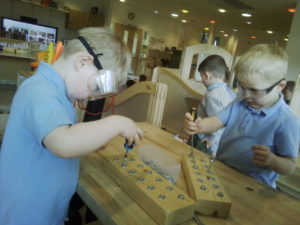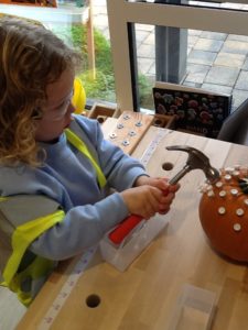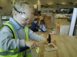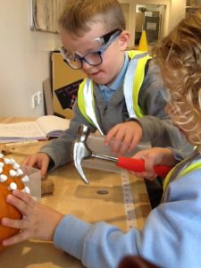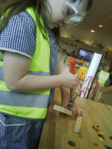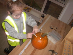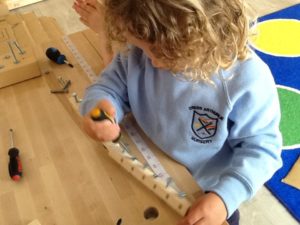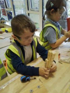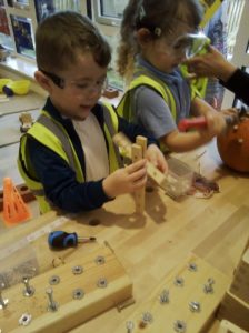 We have been working hard on extending our confidence at the woodwork bench. The children have been practising using the hammer to attach buttons onto wood by carefully putting a nail through the button.