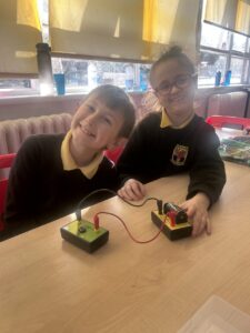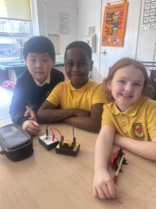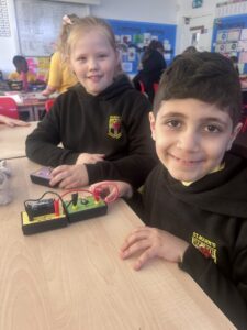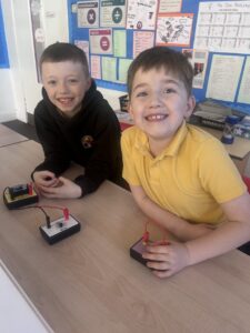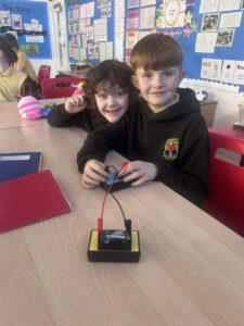 On Friday, we learned about how electricity flows and created electrical circuits. We know that a circuit is like a path and if the path is broken then electricity can’t flow. We used a battery as our power supply and experimented with creating circuits for a motor, light and a buzzer.