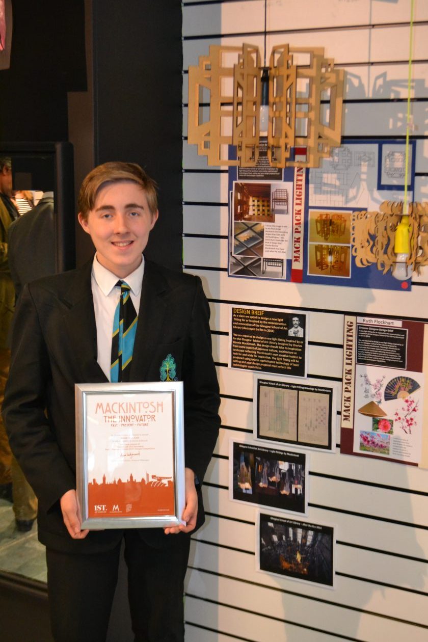 Congratulations to Ewan in S4 who came 3rd in the ‘Mackintosh the Innovator’ competition. Ewan created a fantastic laser cut lighting piece, which has been on display in the St Enoch Centre since June this year. After the public vote and judges rounds Ewan came 3rd in the design category. He won £50 and separate prize for the art and design department. This is a wonderful achievement, as it is a Glasgow City Council event and Williamwood High School was competing against five other schools. Well done Ewan.