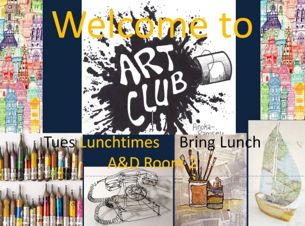 Join in the activites of Art Club 2015 in Art Room 2 every Thursday lunchtime. Bring a packed lunch, meet new friends and try out new drawing materials.