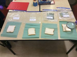 This is a photograph of another science experiment to find out which conditions cause the most mould growth on a piece of bread.  We found out that damp and dark conditions caused the mould to spread the quickest.