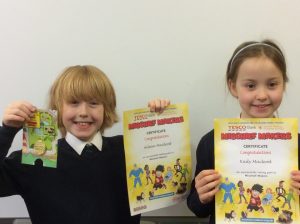 Fhuair Ailean agus Kady teisteanas airson pairt a ghabhail anns an Tesco Bank Summer Reading Challenge aig an leabharlann. Bha aca ri 6 leabhraichean a leughadh thairis air na laithean-saora. ‘S math a rinn sibh!
