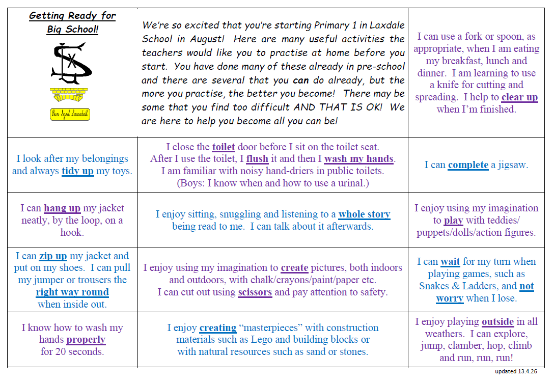 Welcome to the Pre-School / Primary 1 Transition section of our website. This section will provide you with answers to some questions you may have about starting Primary 1 at Laxdale School, and introduce you to our school if you are new to our school community.