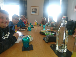 Bha Mr MacKenzie a’ feitheamh oirnn agus chaidh sinn an uairsin gu priomh oifisean “Scottish Salmon Company”  Chuir iadsan air doigh dhuinn buffet a bha sgoinneil agus dh’innis iad dhuinn beagan mun chompanaidh.  Thainig cuideigin an uairsin a-steach le ice-lollies dhuinn, abair treat!!