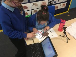 P5-7 EM had a strange challenge to finish our Stone Age to Iron Age topic- turning to archeology, excavating Stone Age poop! Each pair were given two poops and had to excavate each and note what they found, they could also use the Dinolite microscopes to see close up on the laptop screen. Once they had noted and counted what was in each poop they had to use this evidence to discuss and decide which was from the Palaeolithic period, when they were hunter gatherers and which was from the Neolithic period, when they had started farming!