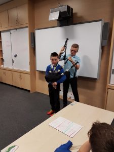 Fhuair Seamus agus Fraser pìoban ùra, agus sheall iad dhuinn ciamar a tha iad ag obair anns a’ chlas. Seo a’ chiad phìob a fhuair Fraser a-riamh, agus bha Seamus ga chuideachadh gus an cur ri chèile.