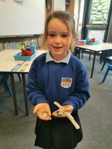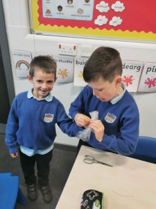 Bha Kate ag innse dhuinn mu dheidhinn plastaig anns a’ mhuir agus cho cunntartach ‘s a bha e airson beathaichean mara. Thuirt I gu robh baga plastaig coltach ri muir-teachd agus gu robh beathaichean gan ithe. Bha sinn ag iarraidh faighinn a-mach a robh sin fior.  Rinn sinn muir-teachd a-mach a baga plastaig. Dh’obraich sinn ann a buidhean agus bha e gu math doirbh!