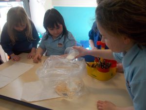Dh’ionnsaich sinn cuideachd mu dheidhinn ar stamag agus ar caolan. Tha obair sonracihte aca. Rinn sinn experiment a sealltainn mar a tha biadh a gluasad tro ar corp a cleachd poca plastaig  airson stamag.