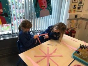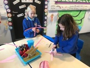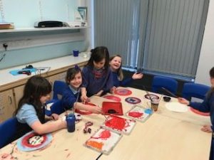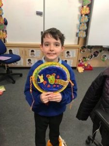 Seo na drumaichean a rinn sinn airson Blaidhna Ur nan Sineach. Leugh sinn sgeulachd mu dheidhinn Nian, uilebheist a bha a cuir dragh air na daoine ann a Sine o ‘chionn fhada. Bha aig na daoine ri fuam a dheanamh, teine a lasadh agus aodach dearg a chuir orra airson an t-eagal a chuir air. Rinn sinn torr fuam, cha tig uilebheist faisg air an sgoil againne!!