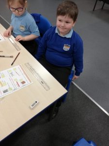 Ann am matamataig tha sinn air a bhith ag obair air tomhais. Seo Clas 1 a’ tomhais cho fada sa tha diofar rudan a’ cleachdadh “paper-clips” agus strabhan. Bha clas 2 a’ cleachdadh an lamhan airson rudan nas motha a thomhais.