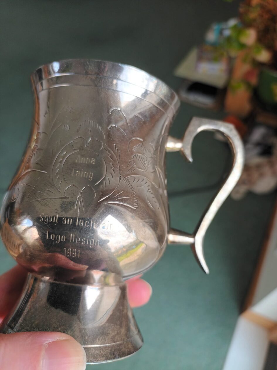 Our school badge was designed by Anna Laing originally from Stilligarry. This was in 1991 when Anna was a P7 pupil. She was inspired by the swans swimming on Loch an Òs. Anna was presented by the then Head Teacher, Mrs Patricia Morrison, with a cup to commemorate her success.