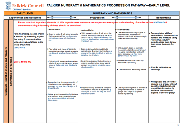 Click on the links below to download Falkirk’s Numeracy and Mathematics Progression Pathways. These are our core documents to support planning, tracking and monitoring from Early to Fourth Level.