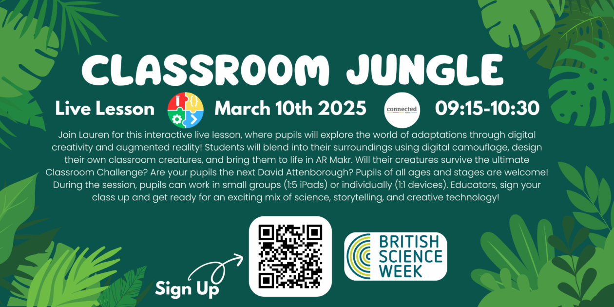 In March 2025, Connected Falkirk’s Lauren McKechnie led young explorers in this ‘Classroom Jungle’ live interactive lesson based on the British Science Week theme of ‘adaptations.