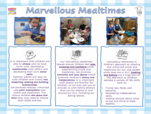 We follow Falkirk’s Marvellous Mealtimes Approach to homelike and nurturing mealtime experiences. Our aim is that snack and mealtimes should be happy and relaxed occasions, as food and eating with others is an important part of a child’s social development.
