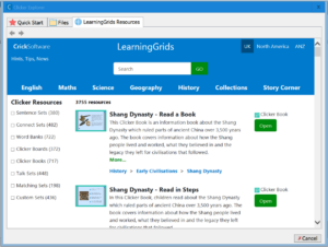 The LearningGrids tab can be found when you first open Clicker or by clicking on the yellow Explorer folder icon. LearningGrids contains nearly 4,000 pre-prepared Clicker Sets and resources.