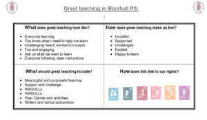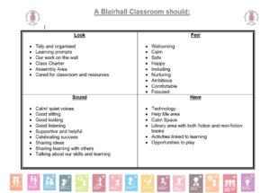 The above link will share with you the expectations we have for every classroom in Blairhall Primary. We have worked with groups of children to create this document, which is displayed in each classroom.