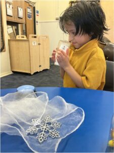 Our topic has been about the Scottish weather, and we have been making rainy day pictures, exploring the weather through our sensory story and sensory trays filled with ice and water. We also made woolly hats and printed tartan kilts using cars in paint.