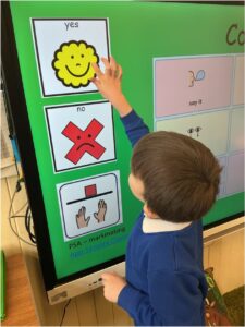 In yellow room we have been learning to recognise and use core words. Some of us are now tapping the core board to communicate words like “again”, “more”, “yes” and “no”. Louis represented our class at assembly and used a recordable button to share a Scottish poem.