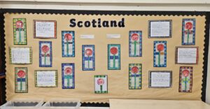 We have been looking at Scotland this term because we were responsible for putting on the St Andrew’s Day service along with Primary 5/6. We looked at Scottish culture and Scottish traditions. We used Scotland as inspiration for some poetry writing. We also looked at Charles Rennie Mackintosh and decorated the Community Centre with our poetry and artwork. We also looked at Gillian Kyle.