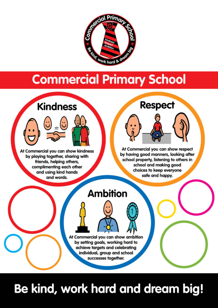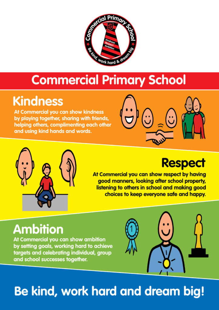 Here at Commercial Primary School our values are Kindness, Respect and Ambition. Below you can find our school values posters which are displayed around our school.