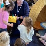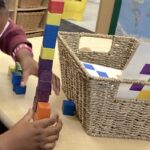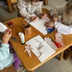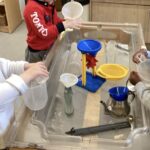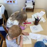 Today some children were exploring mark making at the drawing table. Whilst conversing with our peers we were developing our language skills. Some of the children demonstrated their sorting/ matching skills by sorting the pens into one pot and putting the coloured pencils into another pot. Some of us helped make playdough discussing quantities and textures “That’s too much flour!” “It’s sticky!”