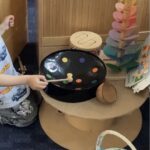 Today some of our children recreated patterns using picture cards, to copy the patterns using the small wooden blocks, developing our colour recognition, pattern making and matching skills. Following on from lots of talk about foods and shops this week we are creating a new learning wall all about ‘food’ in which we will explore our favourite foods, where foods come from etc. Some children have been showing lots of interest in the musical instruments – learning the different names and exploring the different sounds they make.