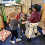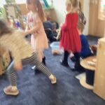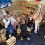 Today we have been busy role playing at the block area. A house was made using a selection of different size blocks & some of the small world dolls. They spent time caring for the babies in the house feeding and caring for them. Outside the hoola hoops have been popular some of the children moved there bodies with them whilst others chose to roll them.