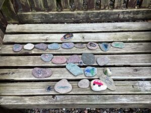 We are all happy to be back at nursery after the Easter break. We’ve been back exploring the nursery garden this morning. Some of us made unicorn stones for the garden using pens. Next we lined them up and counted how many we have.