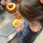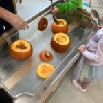 We have been celebrating Halloween in nursery today singing lots of songs & listening to spooky stories. We used the Lycra to stretch & bounce our colour monsters. We used the pumpkins to explore senses where the children had the opportunity to dig through the pumpkin. Some of the children didn’t like the smell or feel of it.