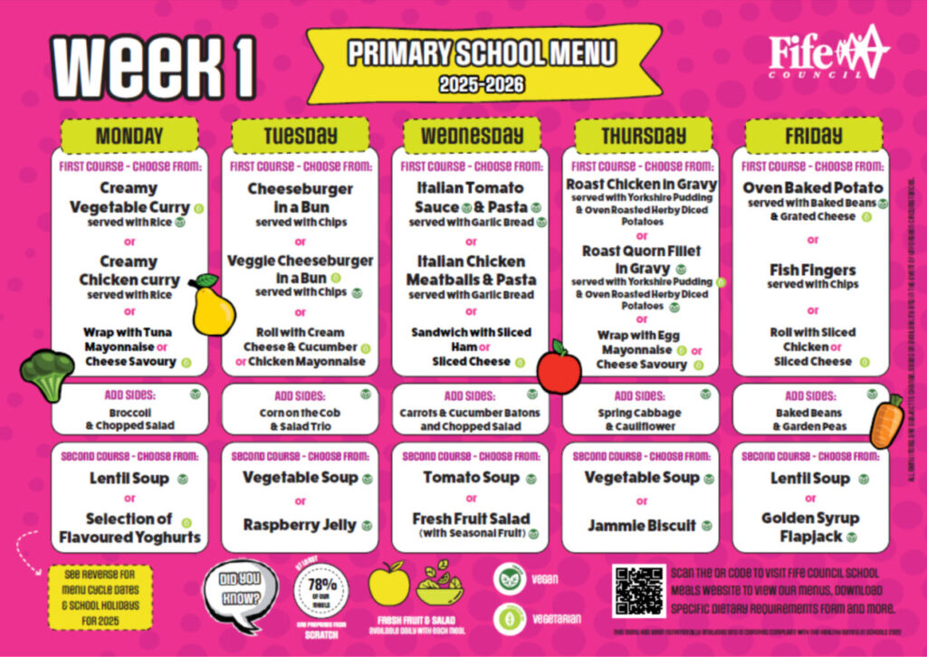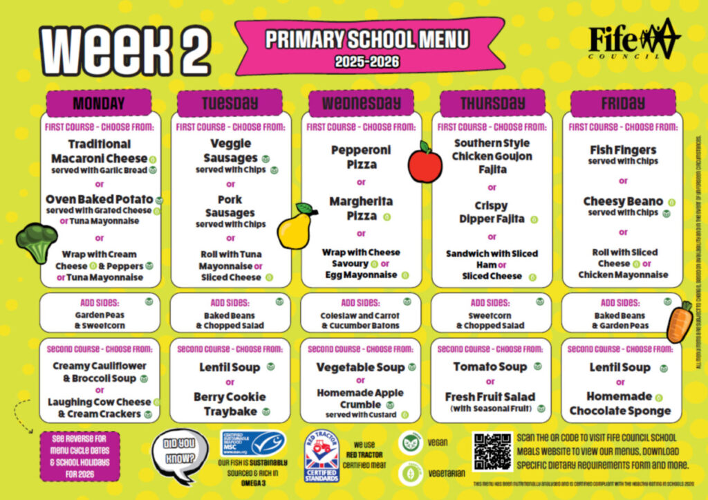 Our primary schools offer two weekly menus that are available on alternating weeks. These menus have been designed to provide nutritious choices that ensure a balanced diet over the week.