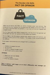 Fact/Opinion – This helps us to look at the issue and work out if it was a fact that something happened to make you feel like this or is it your opinion. E.g. Did your friend not hear you or did they ignore you for no reason.