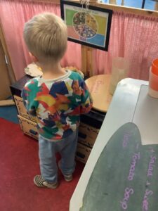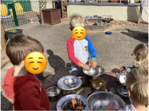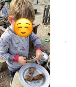 We have observed their use of the water and sand areas, displaying skills htrough their play to pur and talk about which holds more or less, and using the scales to describe the weight. In the sand  area inside and out the children have been creative using a range of natural resources to make cakes and ice cream, along with exploring what happens if they add water to the sand. Lots of descriptive language, and predictions arose from the children when engaged in dialogue with the adults.