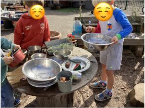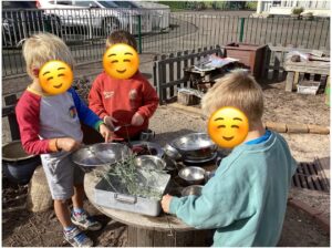Today outside Jackson, Leo, Brodie, Lachlan, Cammy, Reuben, Zac and Jude enjoyed exploring and investigating with water in the mud kitchen. They used paint brushes, bowls and loose parts to create a cleaning potion and another potion that makes you strong. They discussed what they would need in a strong potion and they said “we need this and this in it.” The boys worked together and communicated with each other to use the correct ingredients. 🧪