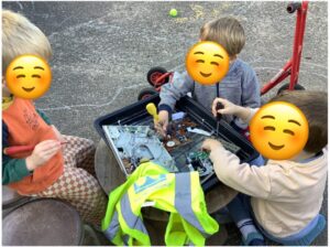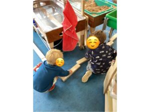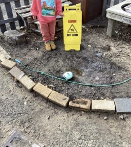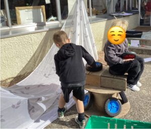 In all weather conditions this week  outside we have observed the children engaging in a variety of role play scenarios where they have assume roles from the world around them. We have seen lots of sharing, and listening to others ideas and lots of detailed descriptive language being used to describe what the items of loose parts are being used for We have seen pirates and treasure maps where a group used their mark making skills to create their maps. Some children have been using skills to investigate and explore to create the best solution in creating a ramp for a truck to go down. While others were seen exploring the flow of water  and how far it would go by pushing it.