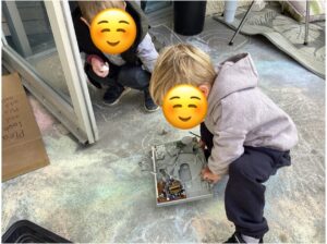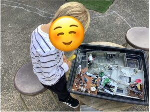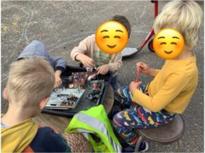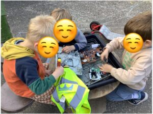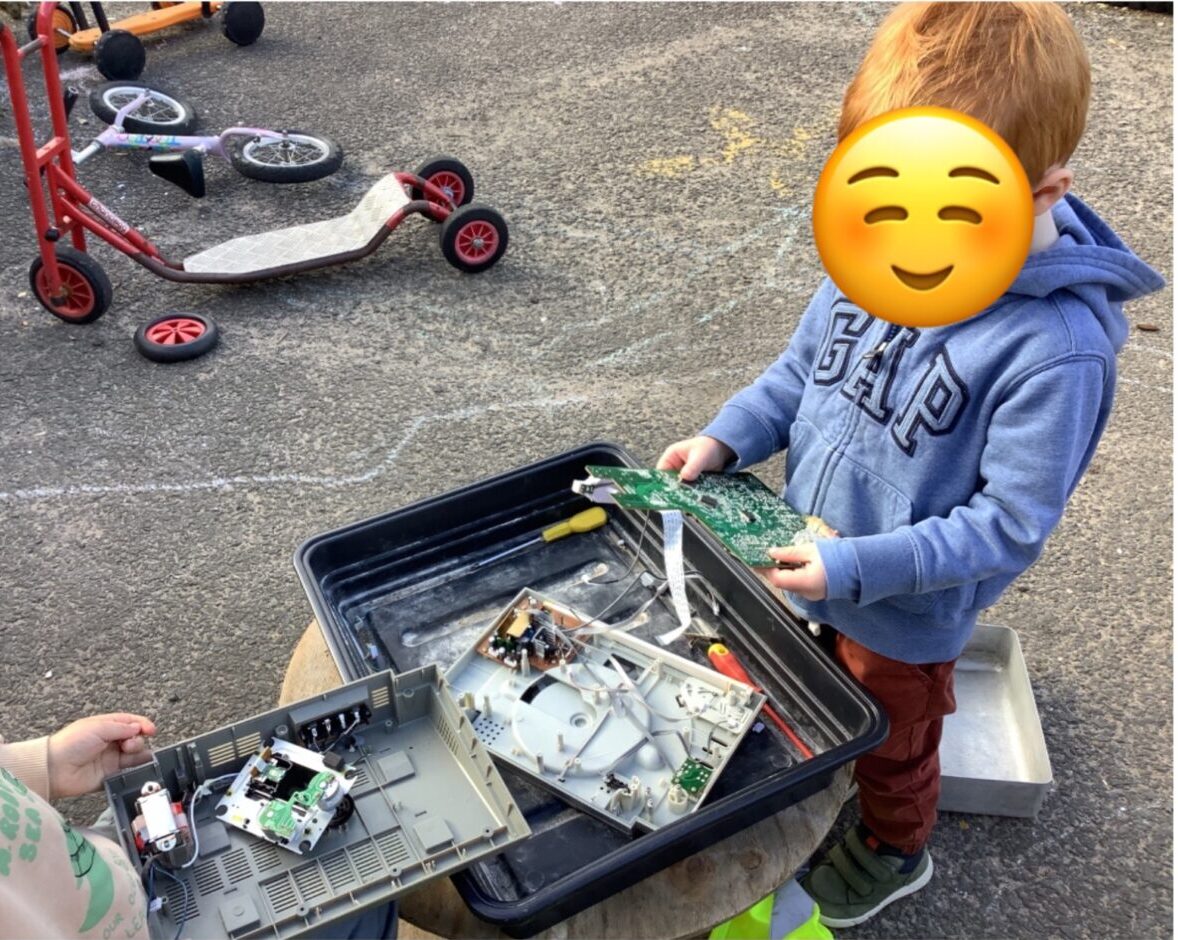 The children have taken an interest in the tinkering table outside as they develop their fine motor skills through using the screwdrivers and unclipping pieces of circuit boards.